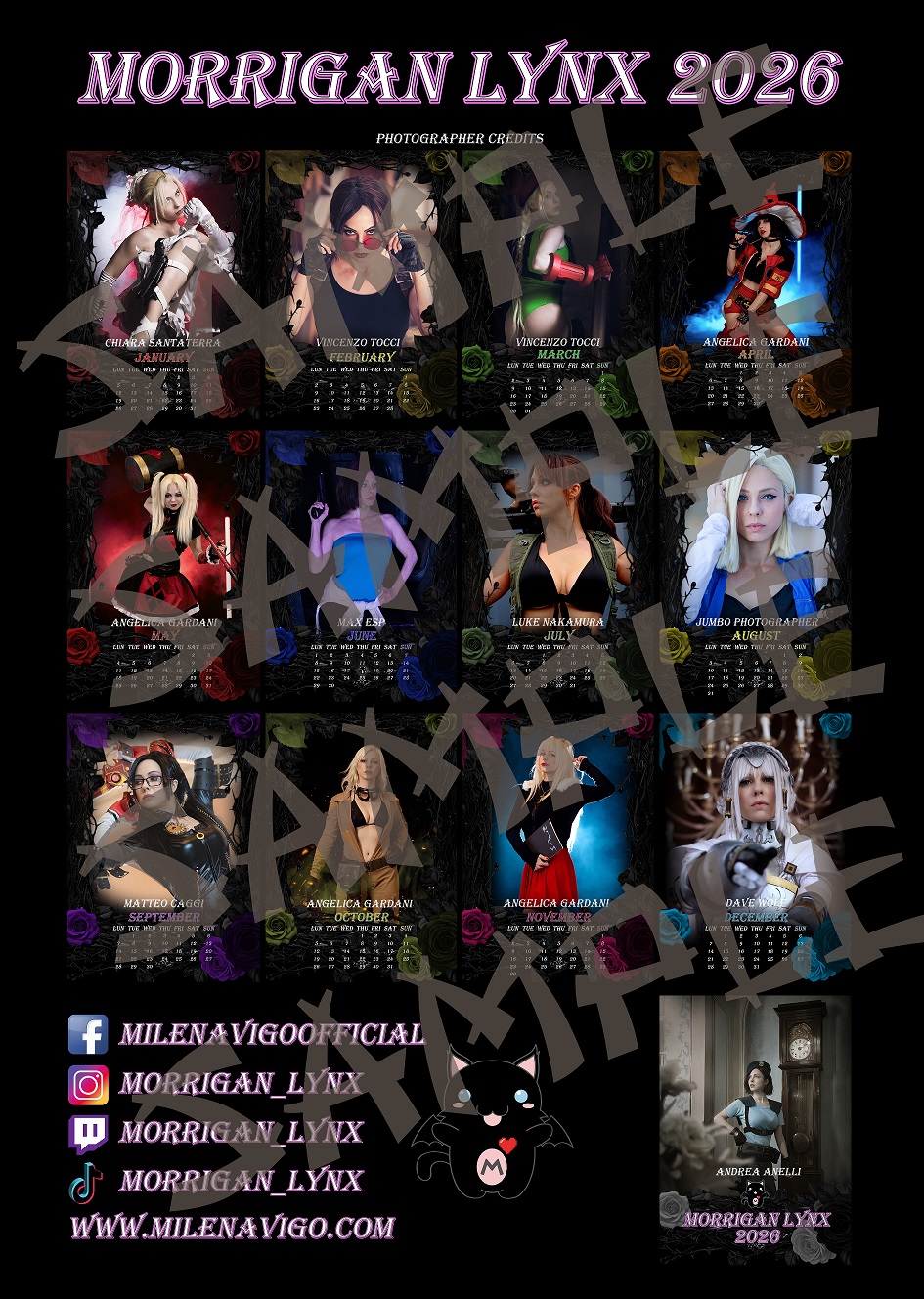 32x45 2026 Cosplay Montly Calendar ( 12 pages + 2 ) By Morrigan Lynx Please tell me the name for the signature ! Thank you !
